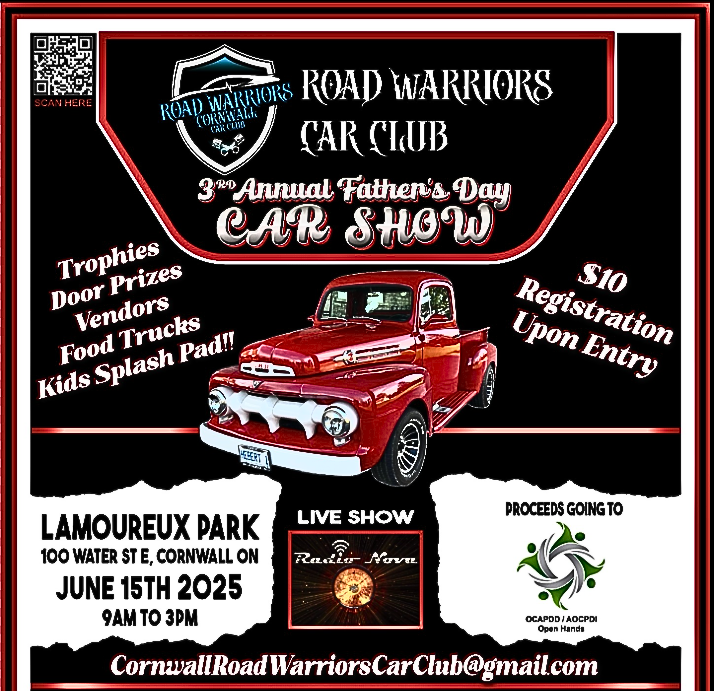 Visit the 3rd Annual Father’s Day Car Show, at Lamoureux Park, June 15th from 9am to 3pm. This free event hosted by The Cornwall Road Warriors Car Club will have trophies, door prizes, vendors, food trucks, a live band, and a kids Splash pad.