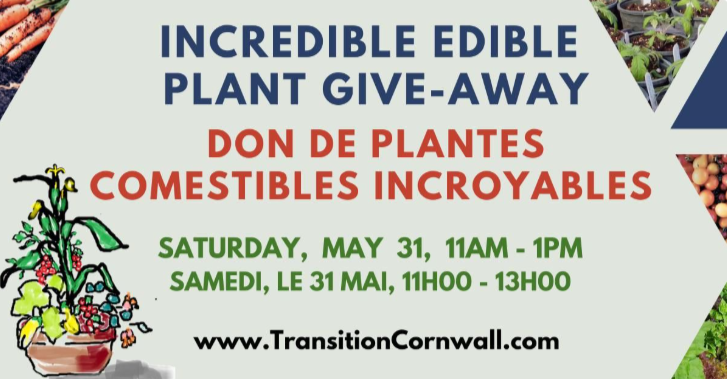 Want to start a vegetable garden this year? The Transition Cornwall+ Food Action Group invites you to pick-up free vegetable plants from one of four neighbourhood pop-up locations in Cornwall and Long Sault on May 31st, between 11am and 1pm. Everyone is welcome! The four neighborhood locations are: