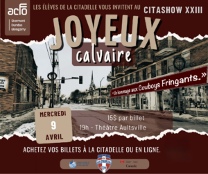 La comédie musicale Joyeux calvaire – un hommage aux Cowboys Fringants, montée et présentée par l’école secondaire catholique La Citadelle du CSDCEO. Fière de soutenir cette initiative locale, l’ACFO SDG convie toute la communauté à venir applaudir ces jeunes artistes. Une soirée riche en talent et en émotions vous attend!