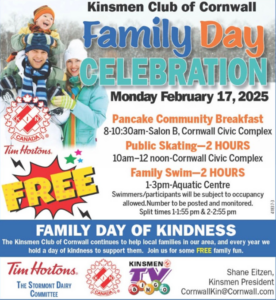 The Kinsmen club of Cornwall is sponsoring three family fun events at the Cornwall Civic Complex and the Cornwall Aquatic Centre on Monday February 17, 2025. All events are FREE. Please note that scheduled events are subject to capacity limits.