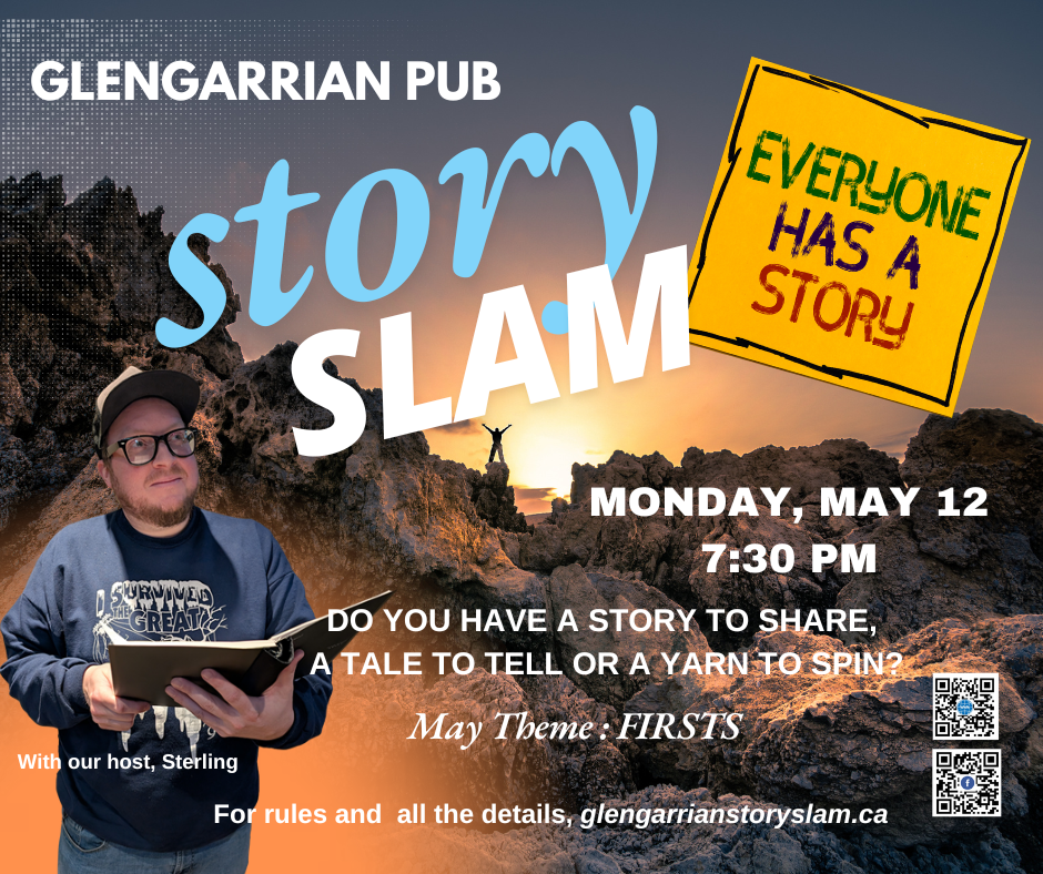 Stop by the Glengarrian Pub May 12th at 7 pm as either a participant or a spectator for their night of storytelling! The theme of this night is “firsts”, and each participant receives 5 minutes to tell the most intriguing and engaging story that they can using nothing but their skill and witt! The best stories can win a prize voted on by a group of judges! Come on down for a good time and there will be prizes for the best stories. Visit the official website here for all the rules and details.